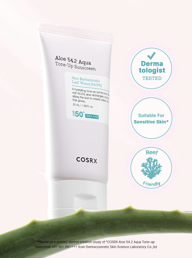 COSRX Aloe 54.2 Aqua Tone-up Sunscreen SPF 50+ PA هو واقي من الشمس متعدد الاستخدامات وفعال يوفر الحماية من أشعة الشمس وفوائد تعزيز البشرة. تم تصميم هذا الواقي من الشمس لتوفير مستوى عالٍ من الحماية واسعة الطيف ضد الأشعة فوق البنفسجية الضارة والأشعة فوق البنفسجية ، مما يساعد على منع حروق الشمس وتلف الجلد.